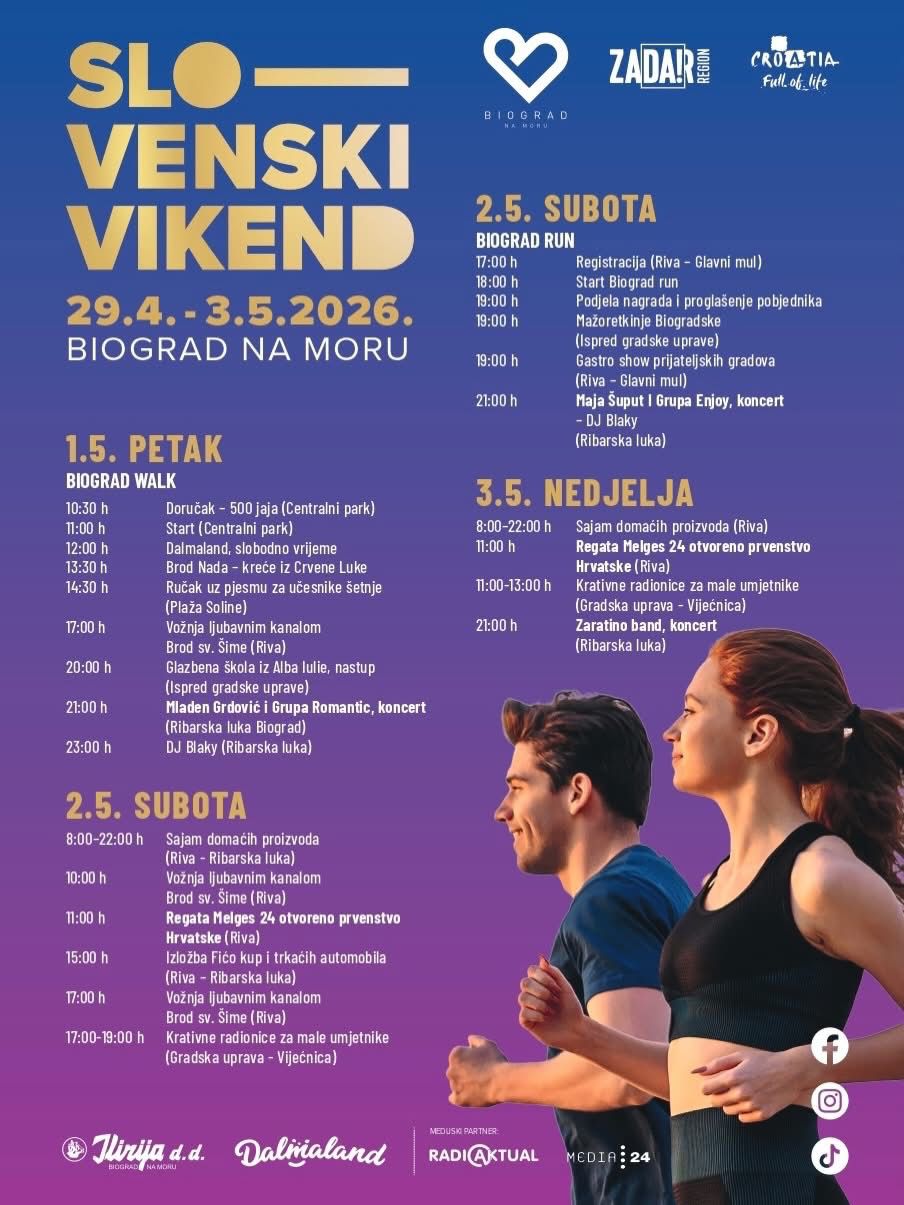 U Biogradu na Moru se povodom Praznika rada održava manifestacija popularnog naziva Slovenski Vikend. Projekt je ovo kojim se posebno ponosimo, a naslov nosi po našim najbrojnijim gostima. Podršku su nam ponudili i time postali partneri projekta i naši dragi gradovi prijatelji iz Slovenije: Slovenske Konjice, Moravske Toplice, Radlje ob Dravi te Žalec. Ovim putem još više jačamo međunarodnu suradnju i prijateljstvo.